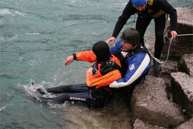 Oba záchranáři musejí mít nůž, který jsou schopni rychle použít, kdyby se něco vymklo. O házečkách jsme už mluvili. Tady je vhodná ta s tlustším lanem, aby na ní záchranář na břehu udržel dva lidi. Alespoň jedna šroubovací karabina. Píšťalka, helma a dobré boty jsou samozřejmostí.