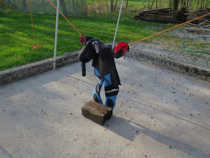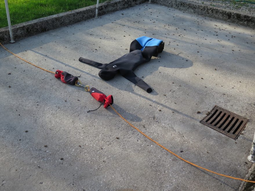 Potom oba spojené pytlíky natáhnete pod místo, kde je zachraňovaný a táhnete je vodou proti proudu.