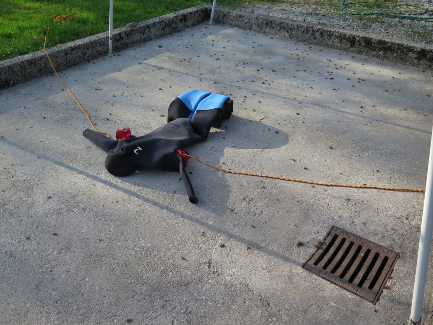 Nejprve je v takové situaci potřeba zajistit, aby měl obličej nad vodou. K tomu potřebujete záchranáře (nejlépe několik) na obou březích. Z jedné strany řeky přehodíte házečku na stranu druhou, kde ji další část týmu spojí s házečkou druhou a do obou pytlíků dá trochu kamení. Pytlíky uzavřete, ať v nich kamení zůstane!