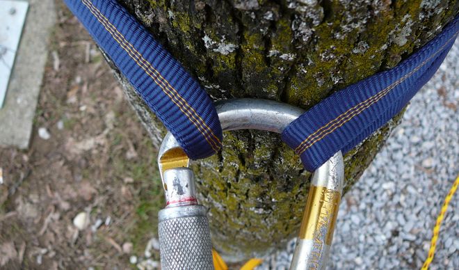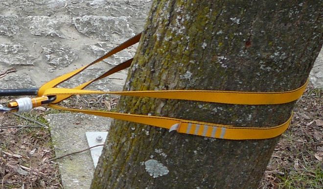 ad 3: Štandu věnuju trochu víc prostoru, protože na něm to doslova všechno visí. Je-li v dosahu tlustý strom, je to hračka (obr. 2 a 3). U kamenů obecně je potřeba, aby nám lano (smyčka, popruh) nesklouzlo a aby se nerozřízlo o nějakou ostrou hranu. U všeho ostatního je potřeba zvážit pevnost v potřebném směru zatížení.