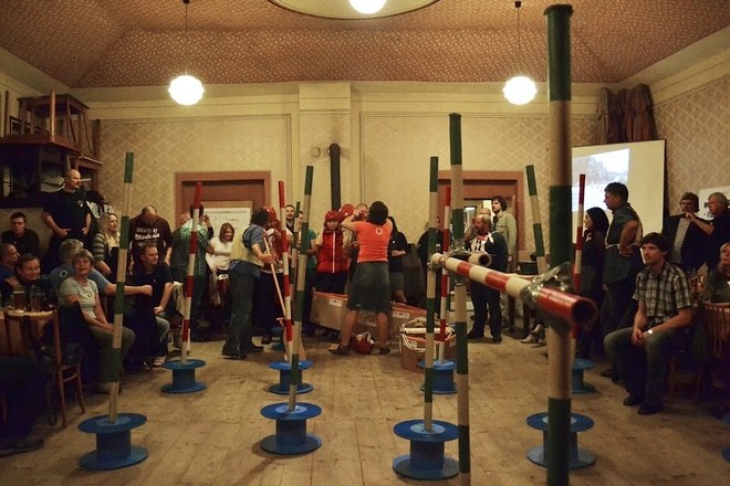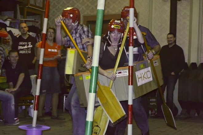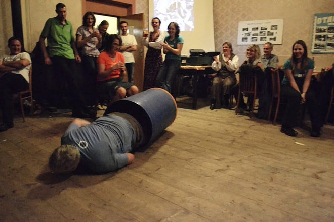 Druhá soutěž s pracovním názvem „Sudoválení s občerstvením zadara“ byla vyhlášena krátce před půlnocí. Startovalo se pokynem 3-2-1-rum, kdy závodník do sebe kopnul zmíněný lektvar, skočil do sudu a dokutálel se na protější stranu sálu, kde nárazem o kamna zastavil časomíru. Technicky nenáročná soutěž doplatila především na aktuální přetrénovanost většiny potenciálních závodníků. Převážná část nastoupila nejspíš omylem, protože nebyla na výkladu tratě a nechala se zlákat vidinou rumu zdarma a bez fronty. Startér Předseda byl nekompromisní a po odstartování tak nebylo cesty zpět. Jakou udělali blbost došlo závodníkům až při nárazu do kamen. Vítězem byl každý, kdo se dokázal ze sudu dostat bez cizí pomoci.
