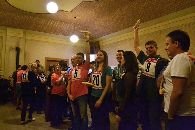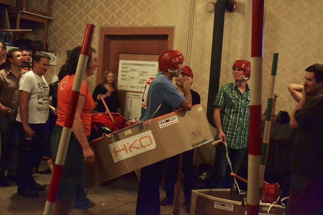 Teď k samotnému průběhu závodu. Do čtvrtfinálových rozjížděk mělo nastoupit 8 posádek, aby měly naše kartonové C2 speciály šanci dočkat se finálové jízdy v použitelném stavu. K našemu překvapení se na startovní listině objevilo hned 13 dvojic. Bylo tedy nutné projít kvalifikací, která spočívala v pojídání rohlíku na čas s hromadným startem.