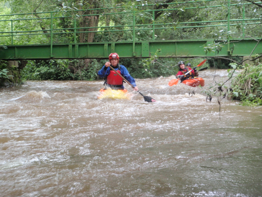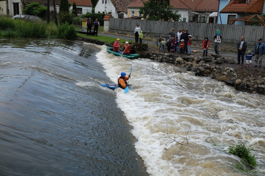 Za Černínem se už objevují i místa, kde je řeka přehlednější, tok je o něco rovnější, ale peřeje a nepříjemné větve, které musíme neustále podjíždět, se zde objevují stále. Po 4 km doplujeme do obce Vevčice, to poznáme podle silničního mostu (silnice č. 398), kde nás čeká sjízdný jez se šikmou spádovou deskou a s menší vlnkou na konci.