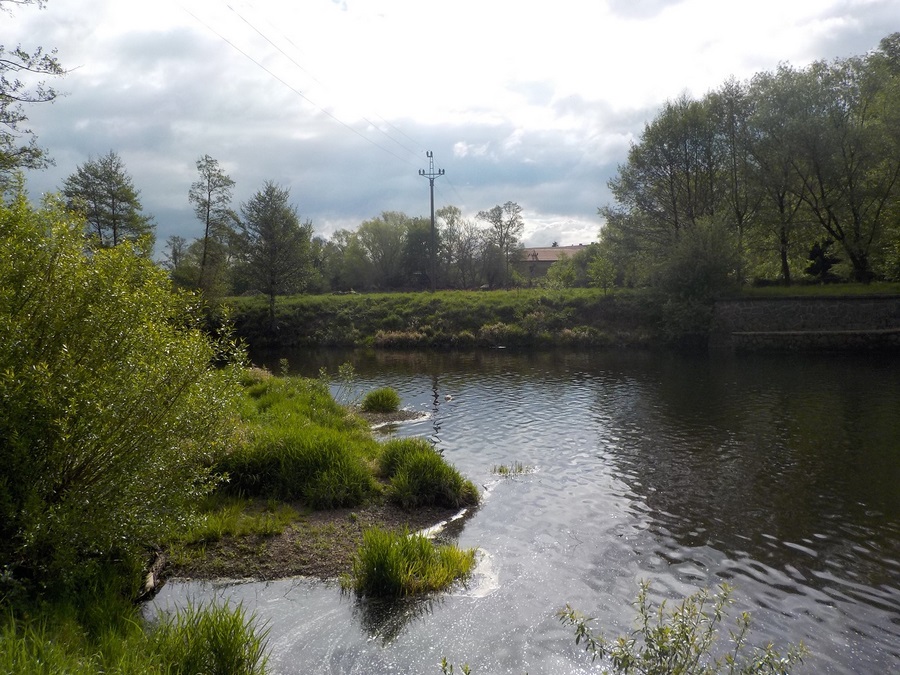 Následuje několik kilometrů poklidné plavby až do Radčic, kde je na ř. km 6,3 nově opravený jez s elektrárnou. Je prakticky suchý, přenáší se vpravo nebo je ho možné přetáhnout přes těleso (pozor, porost obligátně klouže). Má šikmou spádovou desku s výrazným schodem na konci a při slušné vodě býval při pravém břehu sjízdný. Uprostřed se tvořil nepříjemný válec, ale to už jsou díky MVE a „protitankovému“ rybímu přechodu s kameny nastojato jen vzpomínky.
