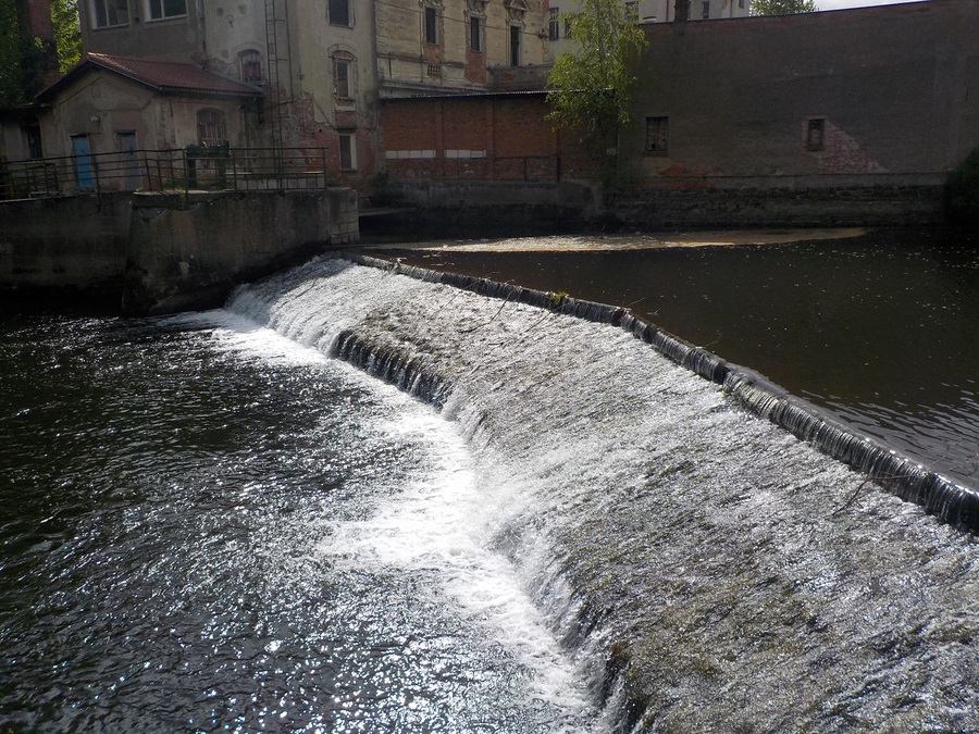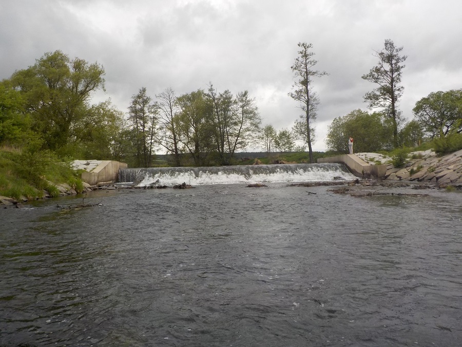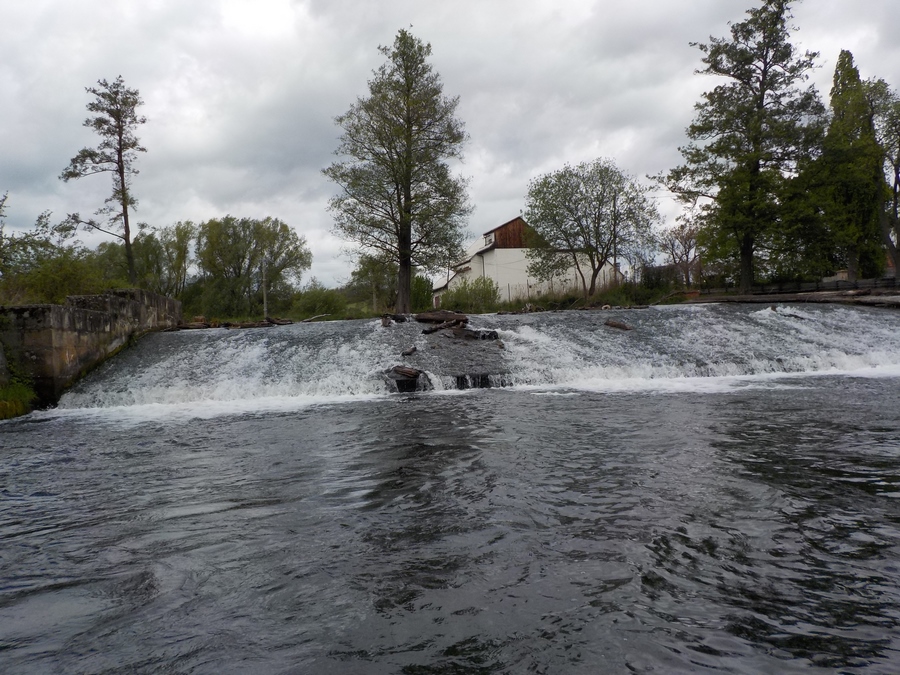 Dále projedeme Touškovem a na ř. km 13,9 dorazíme k jezu Kozolupy. Přenášíme ho vlevo – pravý břeh zabírá továrna a sání. Jez má šikmou, relativně strmou spádovou desku, zakončenou vysokým schodem, a navíc je zvýšen prkennou nástavbou na železných profilech.