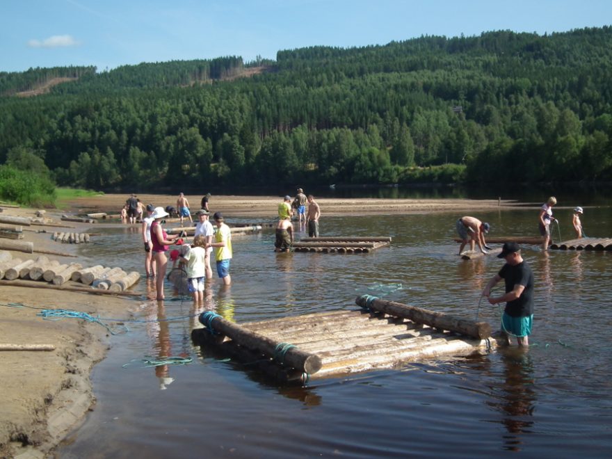 Nasedáme do kajaků a vyrážíme. Řeka je široká a poměrně mělká, takže se musí volit dobrá stopa. Netrvá dlouho a vidíme před sebou první vor. Voda je průzračná, i když to ze silnice nevypadá. Je to zaviněno tmavým pískem. Vor je unášen proudem a k jeho řízení slouží bidla, s kterými se koriguje směr. Zanedlouho potkáváme další vory. Plaví se na nich mládež na prázdninách, ale i celé rodiny s dětmi. Na každém voru vidíme rybářské pruty. Rybolov je určitě dobrá zábava. Na písčinách je možné zastavit a vykoupat se. Většina lidí u nás si myslí, že sever, to je zima a studená voda. Není to pravda. Každoročně se koupu ve vyhřátých jezerech jižního Švédska. Letos byl výjimečný rok. I v jezeře Vänern jsme naměřili teplotu vody 26 °C. Řeka má něco přes 20 °C, a když svítí slunce, je to příjemné osvěžení. Díky své délce nabízí mnohadenní putování s nesčetnými možnostmi táboření.