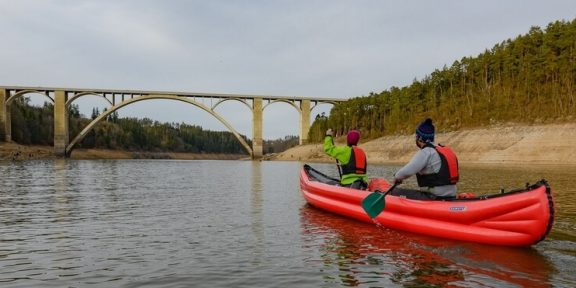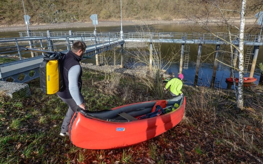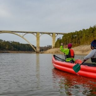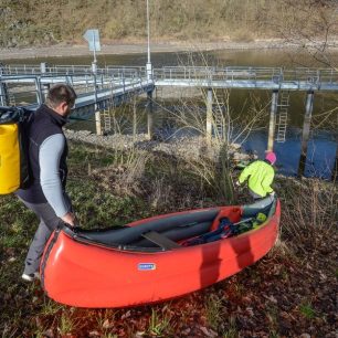 Informační cedule u hráze hlásí: vzduch 7,5 °C, voda 3,9 °C. Uznejte, lepší počasí jsme si v půlce února nemohli přát! Nejsme tu sami, kromě našich nafukovacích lodí se na břehu ve slunci leskne několik plastových kánoí, jejichž posádky se soukají do neoprenových oděvů. Další vodáci právě pendlují auta a budou vyrážet o něco později.