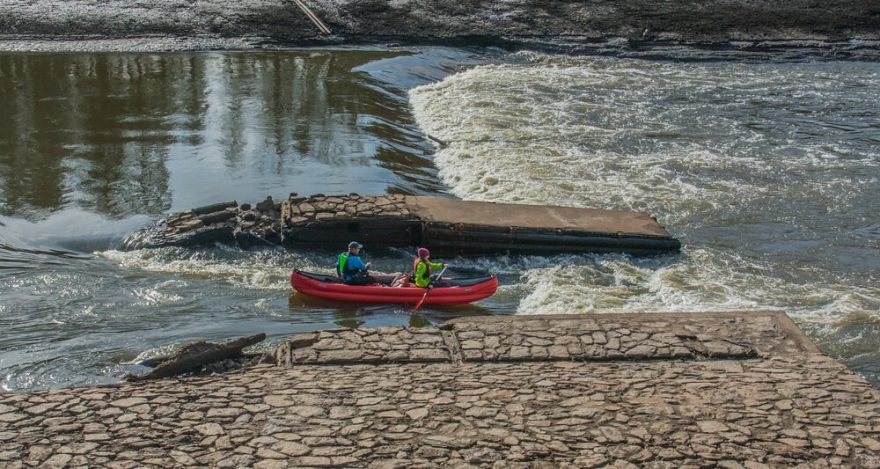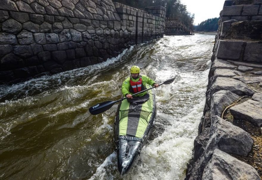 Zajímavé je zde snad vše – vorová retardérová propust u levého břehu, kterou ale za aktuálního průtoku voda neteče. Hned u propusti jsou i zbytky ozubených kol a dalšího vybavení, které sloužilo k regulaci průtoků vody. Ta se nyní všechna valí otevřenou propustí na opačné pravé straně a pod jezem tvoří slušné vlny a válce. Ty navíc ještě rozbíjí proud vody přitékající zprava, z prostoru bývalé vodní elektrárny. Na kánoi Scout si na sjetí šlajsny netroufneme, Snížák ale sedá do nafukovacího kajaku a bravurně šlajsnu několikrát splouvá. Tohle se přece nesmí vynechat!