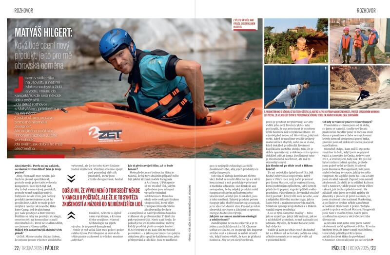 A pak už je na řadě první rozhovor. Pro ten jsme si vybrali Matyáše Hilgerta, kterého asi podle jména snadno zařadíte do firmy Hiko. Matyáš je synem zakladatelů Hika Marcely a Ivana a aktuálně ve firmě pracuje zejména na vývoji nových produktů. Řeč byla samozřejmě o tom, jak takový vývoj produktů probíhá a co obnáší, ale také třeba o tom, jak Matyáš v útlém věku přestal pádlovat a jak se k vodě vrátil.