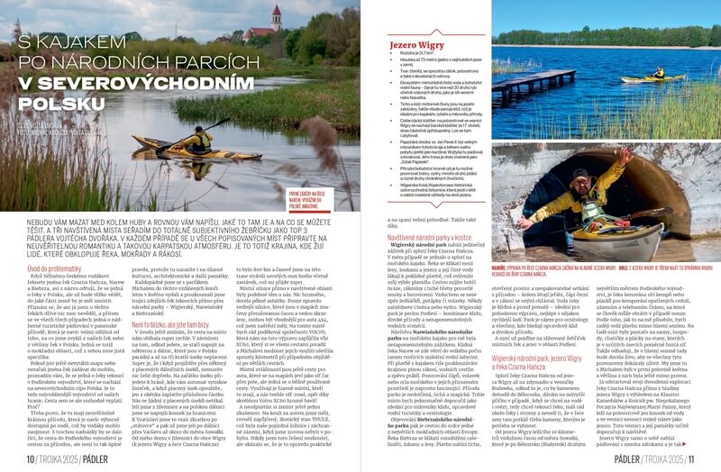 Potom už je tu obsáhlý článek od Vojty Dvořáka, který se s kamarádem Michalem a svým mořským kajakem vypravil prozkoumat málo navštěvovanou část Polska – Podleské vojvodství. Že netušíte, kde to je? My to v redakci taky netušili. Nicméně si článek určitě přečtěte, protože tenhle severovýchodní cíp Polska je prošpikovaný překrásnými národními parky a v nich se dá plout na lodích. A podle vojtova vyprávění a fotek to rozhodně stojí za to!