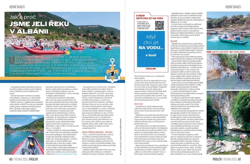 Na minulé vydání Pádlera navazuje Robert Kazík, kde popisoval řeky v Černé Hoře. Tentokrát se s ním podíváme jen o kousek vedle a sice na řeky v severní Albánii. Krásným tipům bezesporu vévodí řeka Shala, které nabízí skvělé možnosti pro pádlování, a navíc má stejnou tyrkysovou barvu jako věhlasná Soča. Ani Robert prý netušil, že ještě jedna řeka takové barvy existuje.