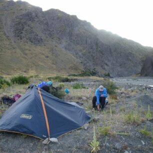 Odpoledne se na obloze objevují první šmouhy jako předzvěst změny počasí a k večeru začíná silně pršet. Voda v řece rychle stoupá. Další chata v nedohlednu, a my jen obtížně hledáme v silném proudu místo k přistání a táboření. Zcela mokří stavíme stany v dešti na podmáčené louce na levém břehu. S chutí zalézáme do spacáků a radostně vítáme teplou večeři obětavě uvařenou naší dcerou. Čtvrtý den ráno stále leje a k balení v dešti nás přiměje jen dobrá zpráva získaná od farmáře na čtyřkolce, náhodou tu hledajícího ztracenou ovečku ze sousedního údolí. Asi po 5 km nás čeká na pravém břehu chata, kde se budeme moci usušit. Řeka nám za noc hrozivě stoupla, voda se zakalila a jde z ní docela strach. Opatrně nasedáme a asi po hodině vidíme na pravém břehu výrazný červený terč s přistávacím místem. Po 50 metrech průchodu hájkem jsme u cíle, na louce vidíme skoro perníkovou chaloupku s krásným jménem Snowgrass Hut. Konečně přestává pršet, vše vybalujeme a tu spoustu mokrých věcí sušíme na verandě. V chatě topíme, převáříme vodu na jídlo i na druhý den a je nám tak dobře, že se rozhodujeme ten den už nejet dál a zůstat přes noc.
