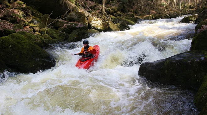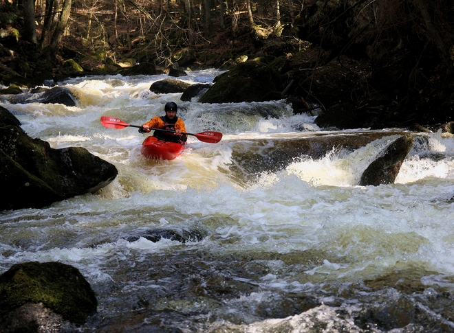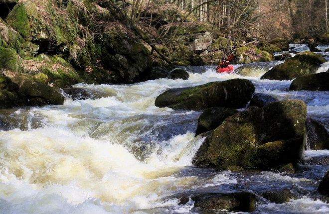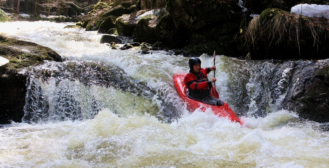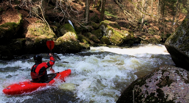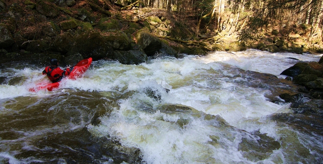 V sobotu posledního března jsem na Wolfsteiner vyrazili znovu, ve větší skupině a chytili jsme vodu vyšší než je uváděna jako vysoká. Řeka se proměnila ve velikou táhlou sjezdovku, ale pořád šla jet a určitě půjde i za víc. Parádní zážitek. Pokud o jarních víkendech tápete kam vyrazit, určitě sledujte vodočet Wolfsteiner Ohe. Dobrou vodu si umí udržet poměrně dlouho a dle toho co jsem viděli, nějaká zásoba sněhu ještě je. Nehledě na to, že o uplynulém víkendu nějaký přibyl. Jen pamatujte, že to není naše Kamenice, ale svižná kontinuální záležitost obtížnosti WW IV – V.