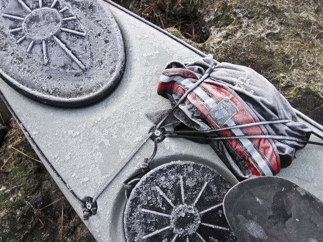 S ledem souvisí i další nepříjemnost, a sice namrzání stříkající vody na oblečení. Je pravda, že to už musí být pořádná rákoska a málokdo by v takové vyplul, ale když už se to stane, je to velmi nepříjemné. Voda se doslova lepí na pádlo, mokré oblečení je jako z betonu a z vodáka se pomalu začíná stávat skleněný mužíček.