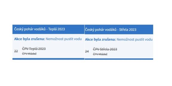 Důvodem je ta skutečnost, že dnešním dnem bylo oběma povodími překvapivě vydáno záporné stanovisko k nutnému nadlepšení průtoku vody v řekách Teplá a Střela. Vzhledem k výše uvedenému jsme tedy bohužel nuceni oba závody zrušit, a to bez náhrady.
